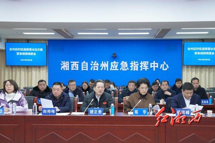 在州應急指揮中心召開的全州應對低溫雨雪冰凍災害緊急視頻調度會上,虢正貴認真聽取8縣市和湘西高新區工作情況匯報。他說,通過全州上下全力以赴的共同努力,度過了一個不眠之夜,全州整體安全穩定,社會反映良好,但是不能有任何松懈,要搶抓4日白天有利時間段,進一步明確工作重點,不斷調整優化工作方案,確保有力有序應對低溫雨雪冰凍災害。虢正貴強調,此輪低溫雨雪冰凍天氣是對基層治理體系和治理能力的現實考驗,各行各業要以高度負責的態度和實戰的標準,牢牢守住安全底線。要有強烈的民本意識,保障好全州廣大群眾尤其是受災群眾的生活,一戶不落開展敲門行動,把情況搞清楚、把災情統上來,把黨和政府的關懷溫暖送上門。對滯留在湘西境內的人員和車輛,保暖、飲水、基本生活和救援要有保障,讓他們感受到湘西溫度。