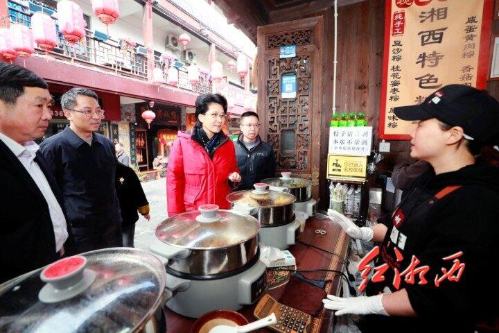 乾州古城內(nèi)張燈結(jié)彩、裝扮一新,“乾州春會(huì)”現(xiàn)場(chǎng)人頭攢動(dòng)、鑼鼓喧天,掌聲、歡呼聲不絕于耳。陳華沿著古城青石板路邊看邊問(wèn),察看民族特色裝飾、湘西風(fēng)情畫展,與沿街商戶、過(guò)往游客親切交談,了解生產(chǎn)經(jīng)營(yíng)情況和游玩體驗(yàn),和群眾一起品特色小吃、觀“乾州春會(huì)”,感受春節(jié)的濃厚氛圍。陳華對(duì)乾州古城景區(qū)的工作給予充分肯定,她叮囑有關(guān)負(fù)責(zé)人,要充分挖掘古城的非遺文化、人文歷史,豐富文旅業(yè)態(tài),改造升級(jí)景區(qū)內(nèi)局部小場(chǎng)景環(huán)境,提升旅游服務(wù)質(zhì)量,把美麗湘西名片越做越美、越做越多。