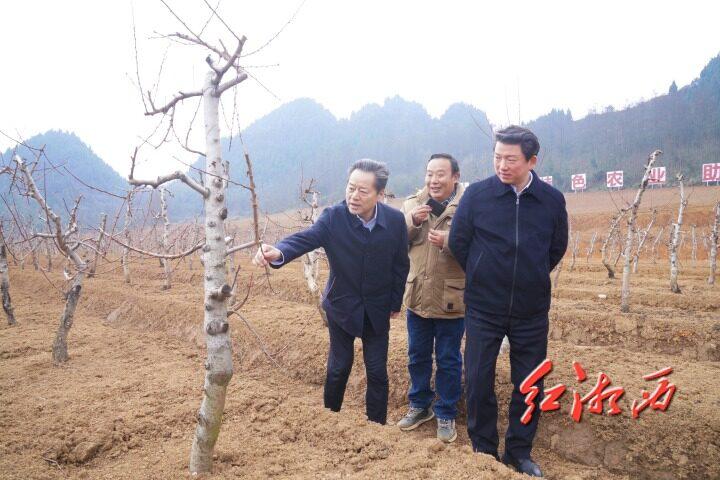 虢正貴調(diào)研十八洞特色農(nóng)業(yè)融合發(fā)展項(xiàng)目并實(shí)地察看果樹(shù)培管情況。