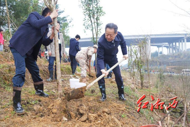 “今年種植了哪些品種,是否容易成活?去年我們種下的樹木成活率如何?一定要加強后續培管,提高栽植成活率。”植樹間隙,虢正貴向州林業局負責人了解詳細了解苗木品種、生長習性和我州植樹造林、綠化相關情況。他強調,全州上下要深入踐行習近平生態文明思想,牢固樹立“綠水青山就是金山銀山”理念,堅定不移走生態優先、綠色發展之路,持之以恒開展全民義務植樹活動,大力營造愛綠、植綠、護綠的良好風尚。要把好質量關,管護好新植樹苗,提高苗木成活率,確保種植一片、長成一片,鞏固生態文明建設成果,讓湘西大地山更綠、水更清、天更藍、 景更美。
