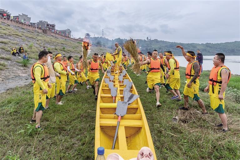 龍舟在下水之前,各個村的龍舟隊都會舉行祭祀儀式,希望通過祭祀給自己船隊和村子獲得一個好兆頭。橈手頭戴儺神面具,手持火把繞船驅邪,祈禱年年風調雨順、五谷豐登。