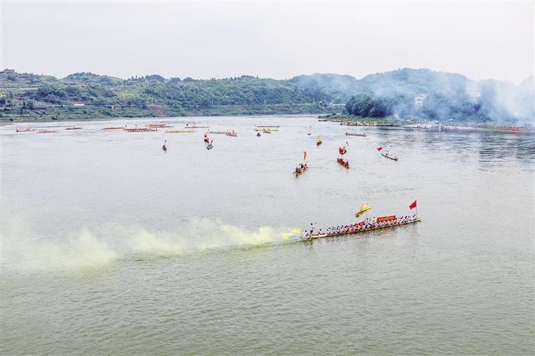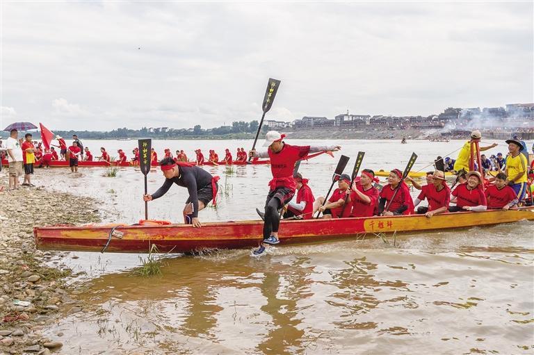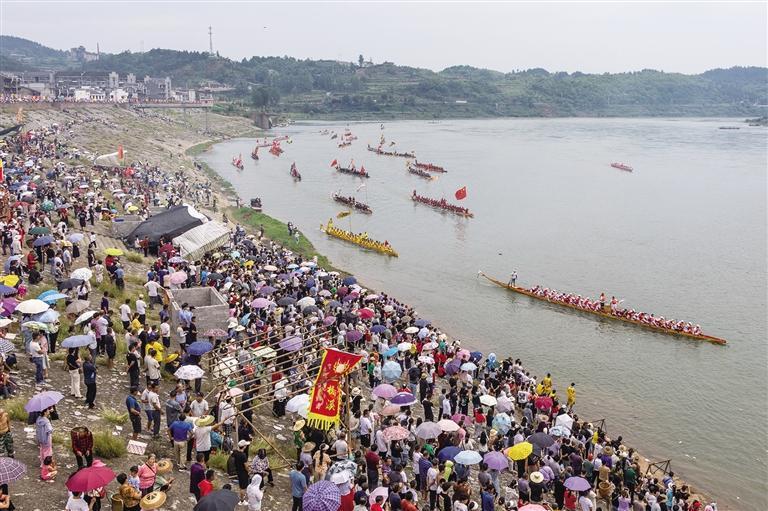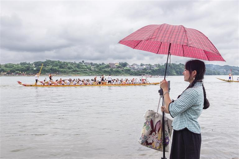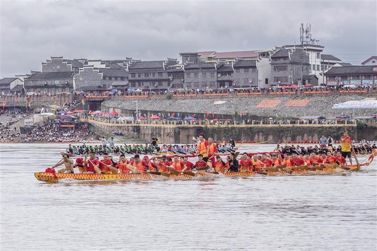 旗手站上龍船,大聲喊道:“一扒國泰民安,二扒風調雨順,三扒旗開得勝,四扒家族興旺發達!”而后,鑼鼓雷鳴,龍舟劈波斬浪,奮力前行。五彩繽紛的“龍旗”逐浪飛舞,站滿江堤的觀眾熱情高漲,人們在此起彼伏的鞭炮和禮炮聲中,龍舟你追我趕的緊張氣氛里,盡享著一年一度的激情與快樂。