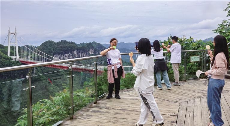 游客拿著矮寨大橋文創(chuàng)雪糕,與矮寨大橋合影。