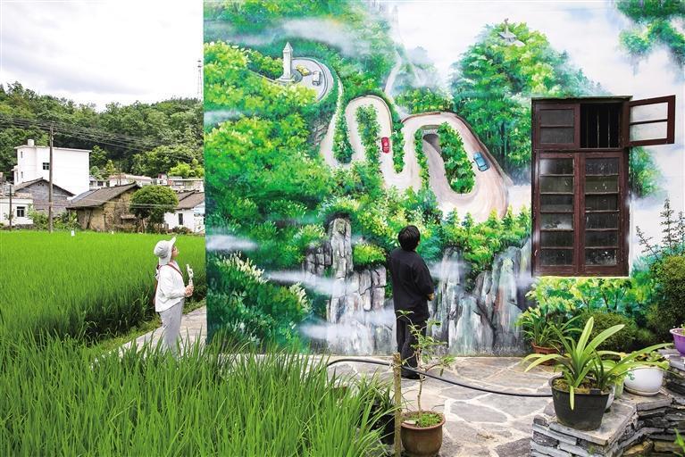 走進村寨,農耕文化氣息濃烈。游客在農耕主題墻繪前欣賞、觸摸。