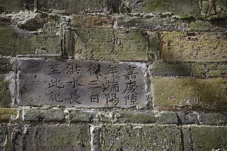 在懷化市中方縣荊坪古村潘氏祠堂的側面高墻上,青磚上記錄了多次洪水最高水位,這對研究沅水及支流的演變具有重要的水文價值。