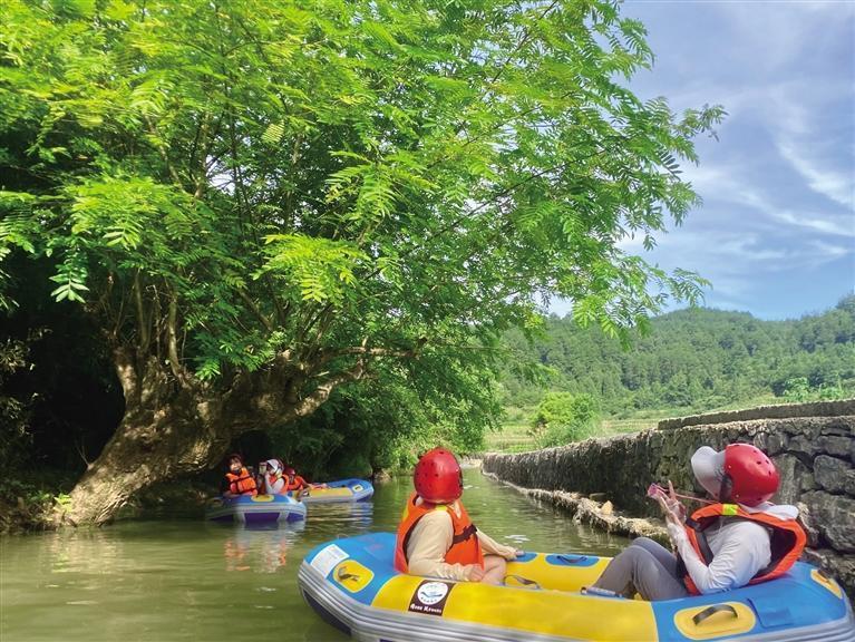 藍(lán)天白云下,遠(yuǎn)處的山林青翠欲滴,河道兩岸茂密的竹林和高大的皂莢樹(shù),倒映在清澈的河水中,陽(yáng)光透過(guò)樹(shù)葉的縫隙,灑下斑駁金光,仿若一幅流動(dòng)的山水畫(huà)卷。這時(shí),游客偶爾闖進(jìn)一片寧?kù)o的河段,乘船聽(tīng)風(fēng)。在緊張刺激過(guò)后,往往更能感受到大自然的寧?kù)o,并從中拾得一份暢快與自由。