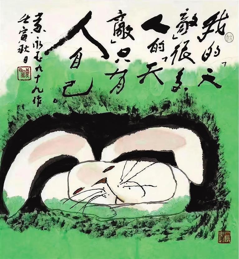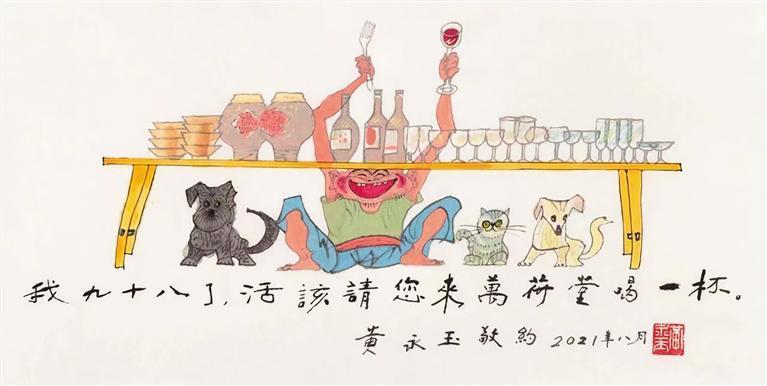 2021年,他畫了一幅《九十八》,自己坐在地上,有貓兒、狗兒陪伴,雙手舉過擺滿酒杯、酒壇的桌子,一只手里是叉子,一只手里是倒滿了紅酒的杯子,下題“我九十八了,活該請您來萬荷堂喝一杯”。熱情、歡快,又有點搞笑。