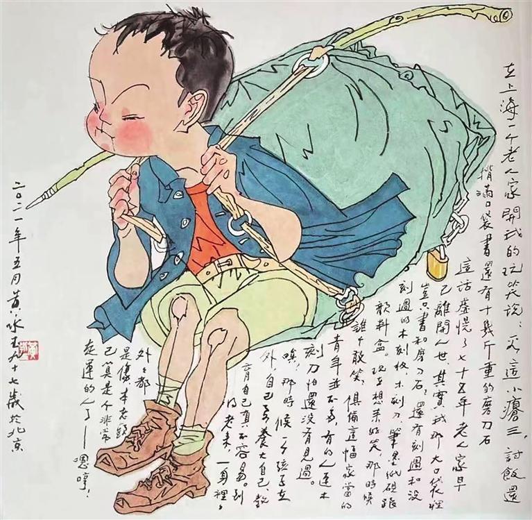 年歲大了,老人喜歡回憶往事。97歲那年,他畫了一幅自畫像《行囊》,圖中的少年,背著一個大背包。他寫道,“在上海,一個老人家開我的玩笑說:看這小癟三,討飯還背滿口袋書,還有十幾斤重的磨刀石……”
