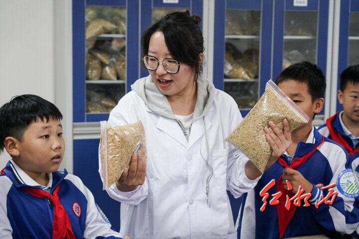 工作人員為學生們講解糧食質量檢驗方法。