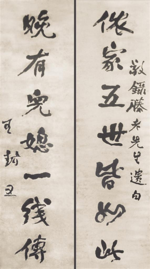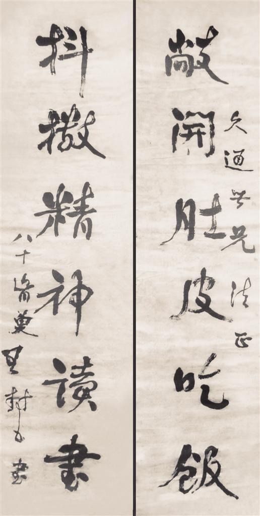 閑聊中,我還得知王家祥珍藏有其師的書法作品。弟子的字都有如此功力,為師功夫何其了得。我欲趁機開眼界,他應(yīng)允從箱底翻了出來,并小心翼翼,徐徐展卷,一看原是兩副行書對聯(lián),宣紙包漿發(fā)黃變暗,已非常老舊。