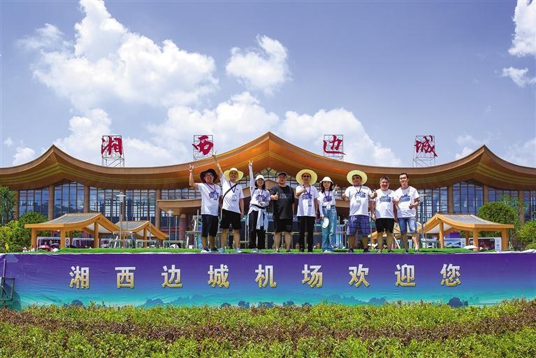2023年8月18日,湘西邊城機場通航,記者楊賢清、歐陽仕君、龍俊玉、龍堯、岳躍強、吳宜芝、朱開朗、林云、胡迎贏(從左至右)在現場采訪。