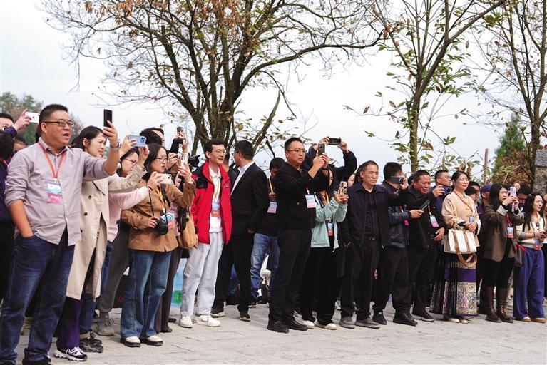 在永順縣雙鳳村,記者、嘉賓們紛紛拿出手機記錄精彩的民俗活動表演。 團結報全媒體記者 楊賢清 攝
