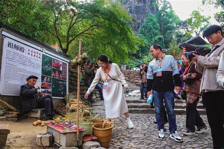 嘉賓在老司城遺址參觀,遇上手藝人編織竹編,紛紛停下腳步觀看。 團結報見習記者 胡承鼎 攝