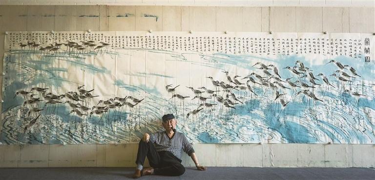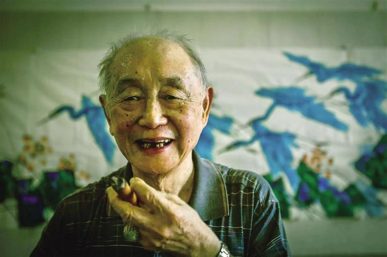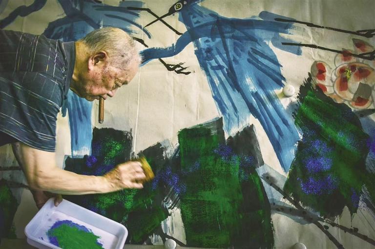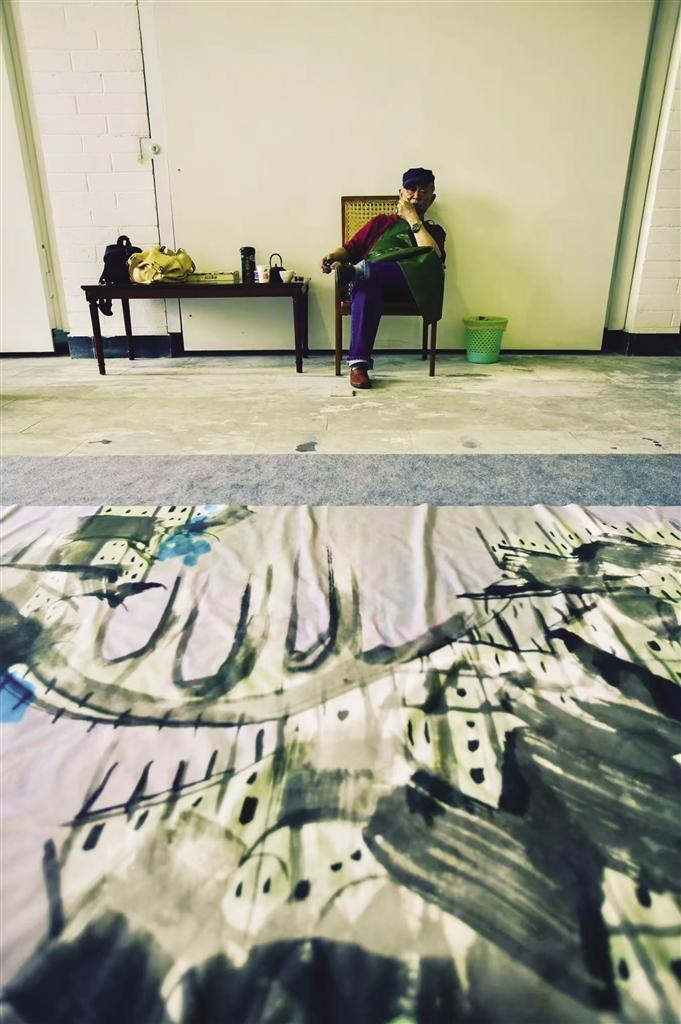 黃老作畫時,口中銜著的雪茄,他覺得是吸取了智慧。手里拿起了排筆,又是將智慧藝術化、具象化。這是他在為《仙鶴荷圖》著色,人畫合一,讓人肅然起敬!