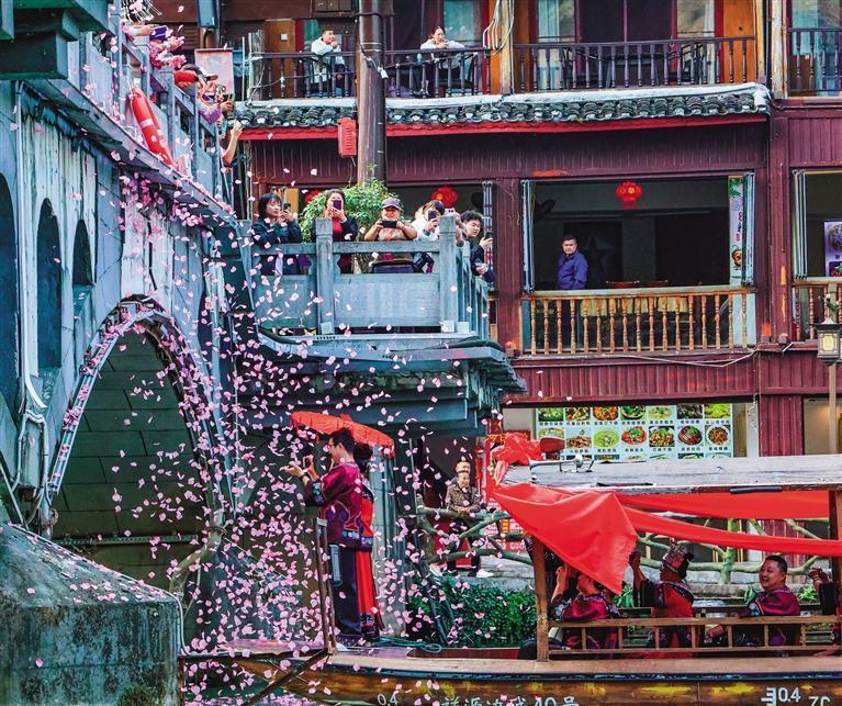 云橋上的苗家姑娘撒下點點花瓣,為新人送上浪漫。 團結報見習記者 胡承鼎 攝