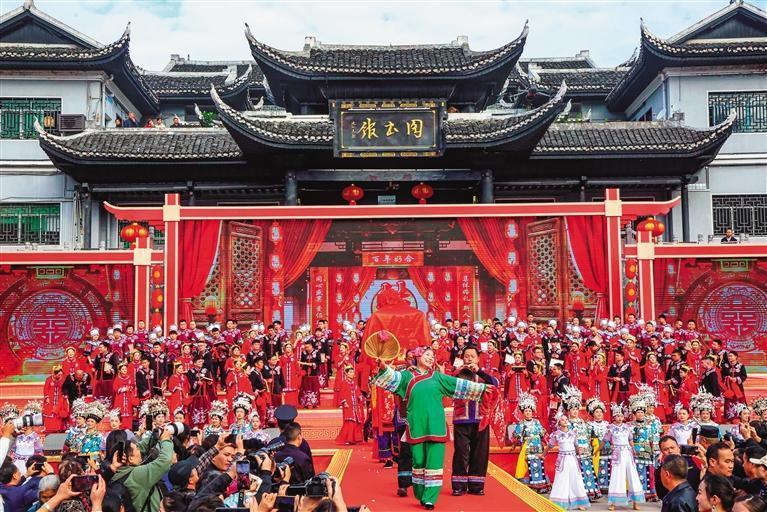 新人喜結良緣,媒婆喜笑顏開,觀眾心花怒放,喜糖從天而降,承載著愛情的甜蜜,被撒向現場的游客。 團結報見習記者 胡承鼎 攝