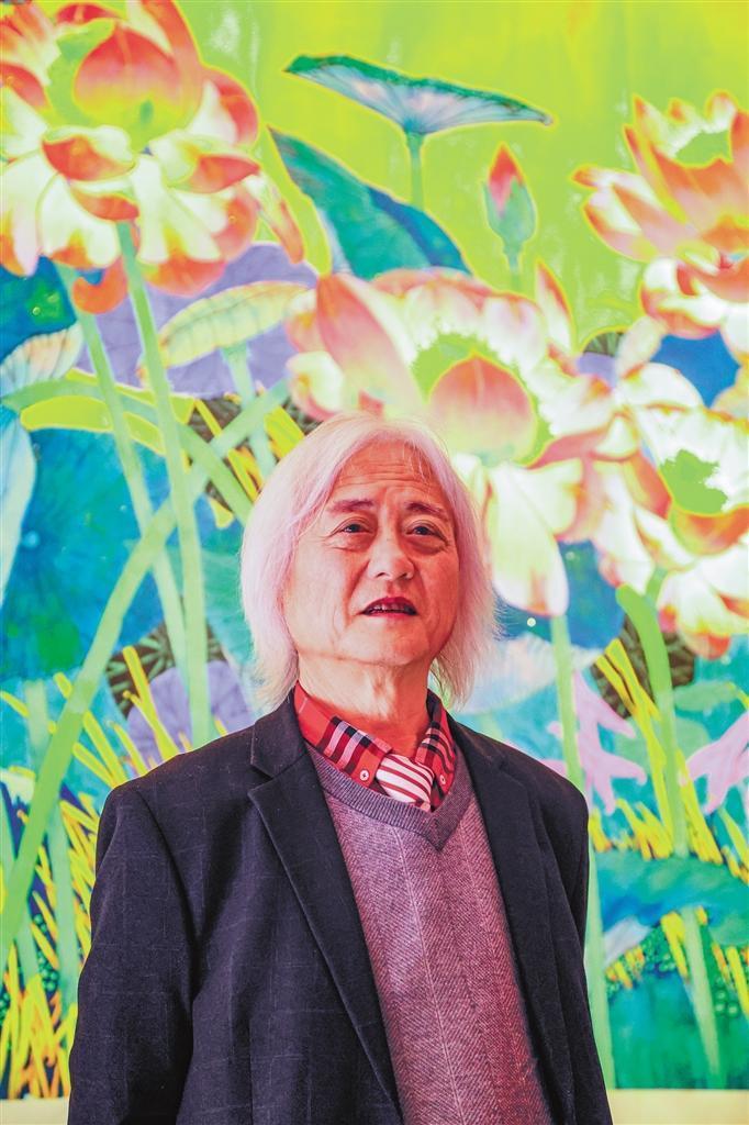 毛光輝站在畫作《芙蓉國里盡朝暉》前。