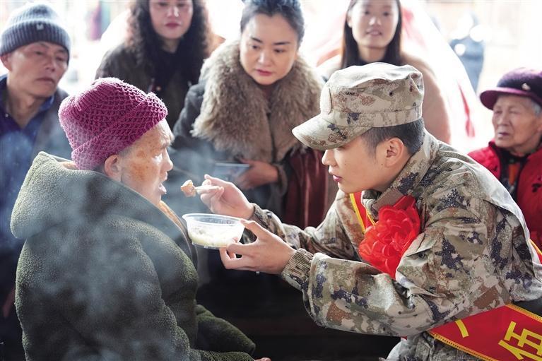 一名新兵為前來送行的婆婆喂紅燒肉。 團結報全媒體記者 伍珊珊 攝