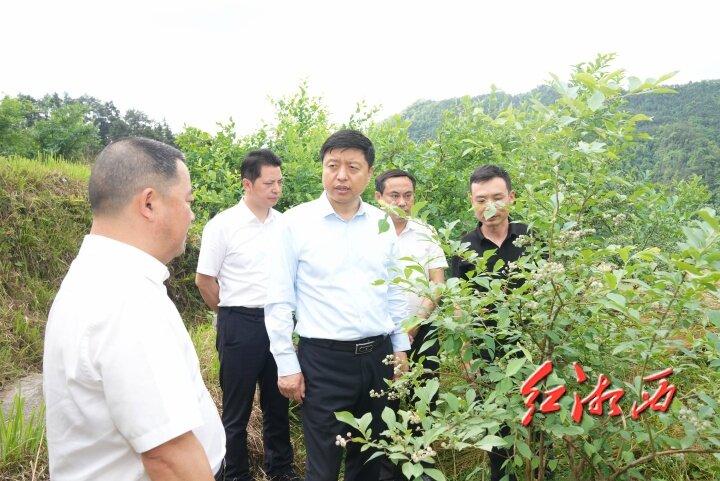 5月9日,劉濤在古丈縣巖頭寨鎮蒿根坪村考察藍莓基地,了解鄉村振興產業融合發展、帶動農民增收等情況。團結報全媒體記者 劉煒 攝