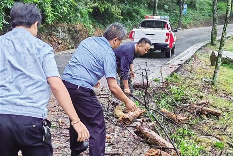 6月19日,永順縣萬坪鎮轄區民警和志愿者清理路面泥石、樹枝等障礙物。 瞿章杰 王津 攝