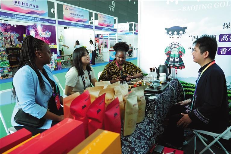 非洲客商在中非經貿博覽會的茶葉展示點品嘗保靖黃金茶。 彭慧 攝