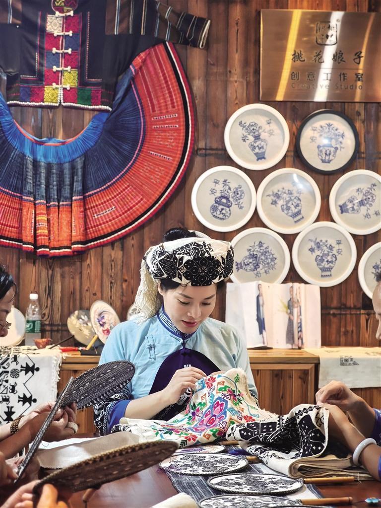 在非遺傳承的路上,滕靜蓉既是守藝人,也是革新者。她的公司將手工苗繡做成日常生活中能用到的家居靠墊、挎包、領帶、香包、公仔、方巾、百褶裙,或嵌入胸章、首飾、茶盒、眼鏡盒里,以滿足消費者不同方面的生活需求。從指尖到生活,從傳統(tǒng)到實用,每一件產(chǎn)品既藏著對苗族文化的深情守望,又飽含對生活美學的鮮活詮釋,讓苗繡成為“看得見、摸得著、用得上”的跨界“爆款”,一時間供不應求,也為繡娘們帶來了月均3000元的額外收入,走上致富路,實現(xiàn)文化傳承與鄉(xiāng)村振興的雙向賦能。