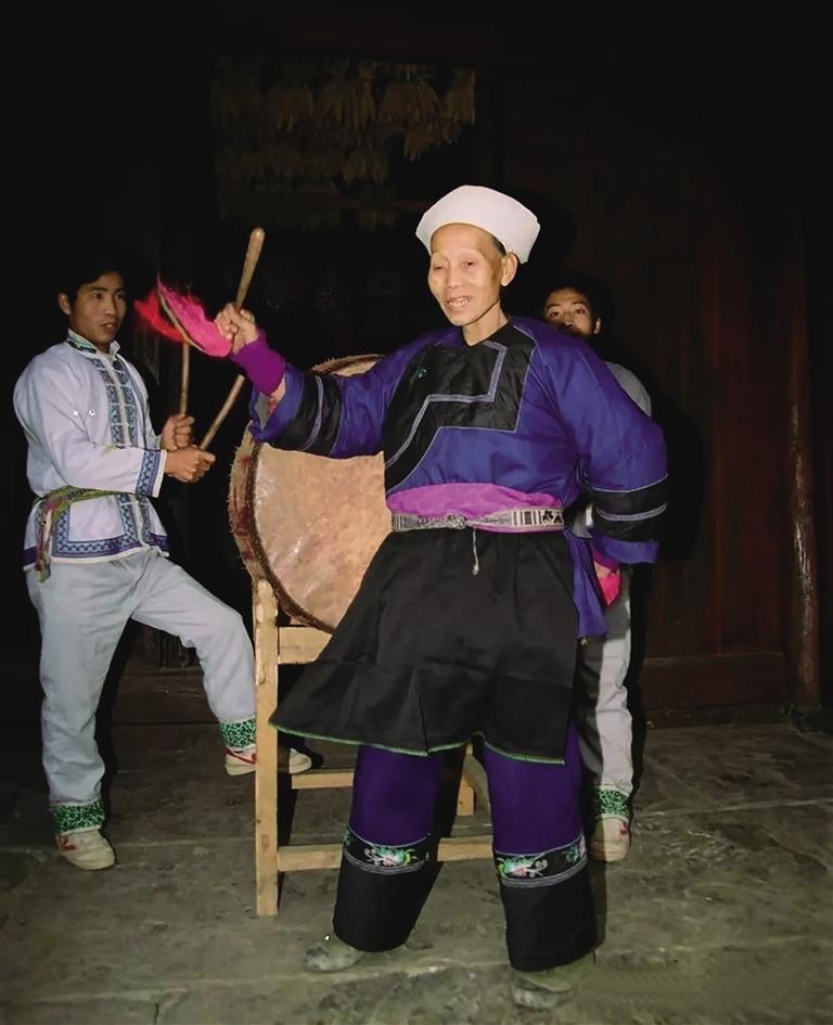 為搶救瀕臨失傳的《接龍鼓》,她徒步三個(gè)月走訪 12 個(gè)苗寨,從 94 歲的龍阿婆處學(xué)得“鳳凰三點(diǎn)頭” 絕技。她的鼓技剛?cè)岵?jì),既有男性的力量感,又不失女性的柔美,被譽(yù)為 “鼓中芭蕾”。