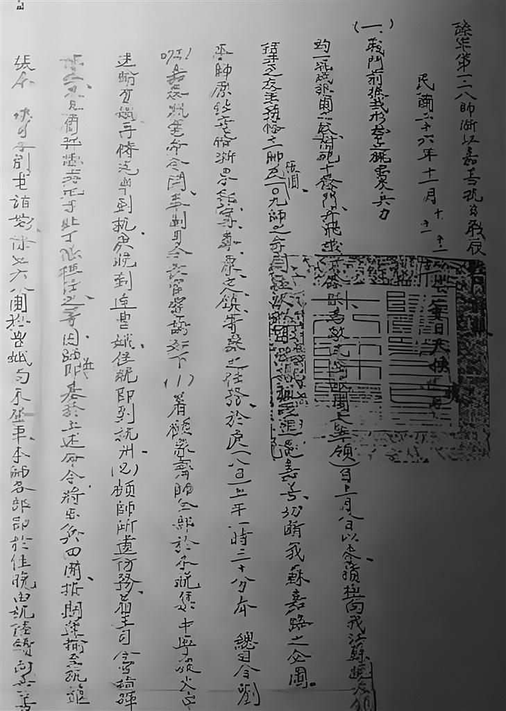 第十集團軍報告嘉善阻擊戰況,涉及128師傷亡情況。“128D顧師長、109D趙師長午后九時電話報告:(1)自九號起,敵以飛機火炮掩護,屢次向我楓涇鎮及公路鐵道附近西河車浜陸浜之線猛攻,我官兵奮勇抵抗,陣地屹然未動,惟工事多被擊毀。(2)我顧師舒團長負傷,官佐僅余數員,兵約四百余名。沈團陣亡中校團附一員,傷營長二,余兵約三百余名。劉團傷營長二員,余兵約六百。陳團傷亡較輕。”(原件存于臺灣檔案機構)