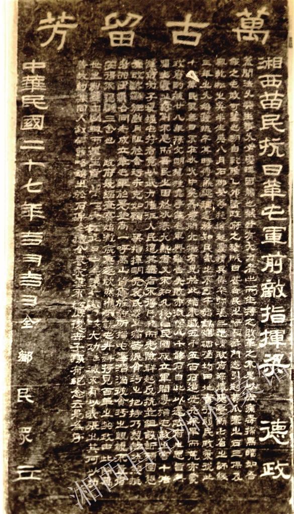 1938年,湘西苗民抗日革屯軍德政碑。由湘西長(zhǎng)樂(lè)鄉(xiāng)(今花垣縣長(zhǎng)樂(lè)鄉(xiāng))全體鄉(xiāng)民集資修建,以紀(jì)念革屯抗日運(yùn)動(dòng)。(湘西州檔案館存有數(shù)字化副本)