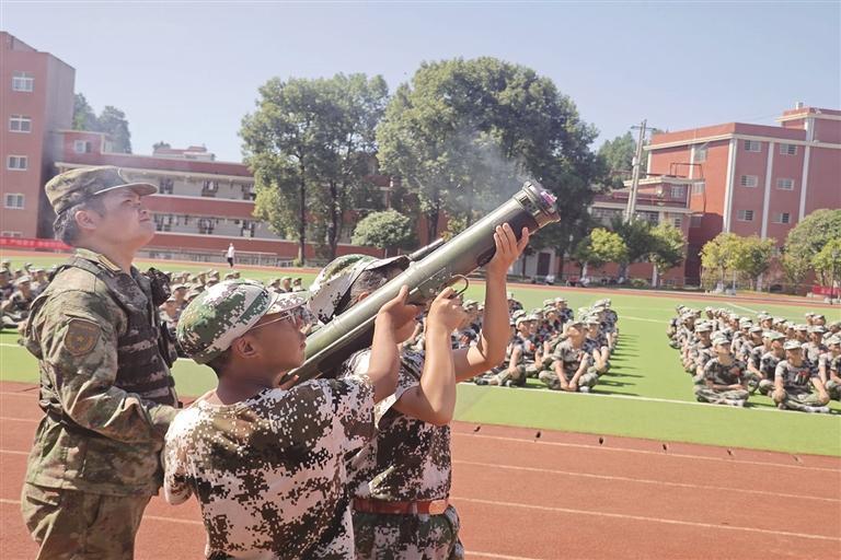 8月26日,在鳳凰縣崇文中學,教官指導學生進行持槍射擊訓練。當天,該縣多部門聯合組織開展“國防動員應急技能培訓進校園”主題活動,通過國防動員、人民防空、防災減災、應急避險等知識培訓以及仿真武器實操,引導學生樹立國防觀念,增強國防意識。 滕建康 攝