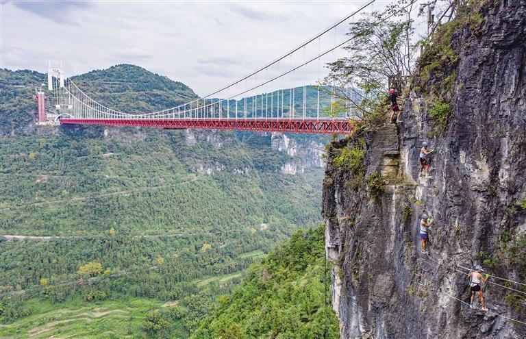在湘西德夯大峽谷之巔,游客正在矮寨大橋上體驗驚心動魄的“云中漫步”高空項目。
