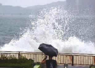 9月23日,市民在香港柴灣杏花邨海邊拍攝海浪。組圖/新華社