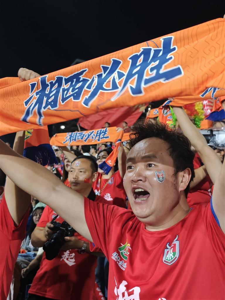 湘西球迷高舉“湘西必勝”橫幅,為湘西隊加油。 團結報全媒體記者 朱開朗 攝