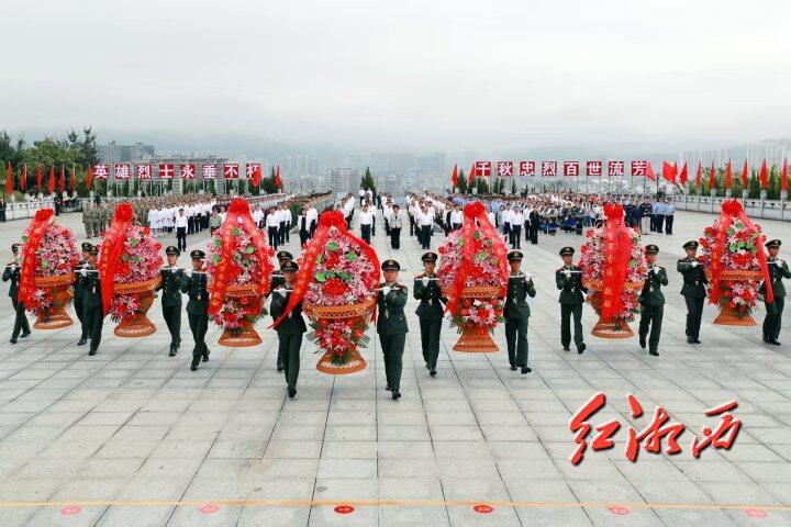 方陣前,以州委、州人大常委會、州政府、州政協、吉首軍分區,吉首市委、市政府以及社會各界名義敬獻的7個大型花籃依次排列。花籃紅色緞帶上,“烈士永垂不朽”金色大字熠熠生輝。