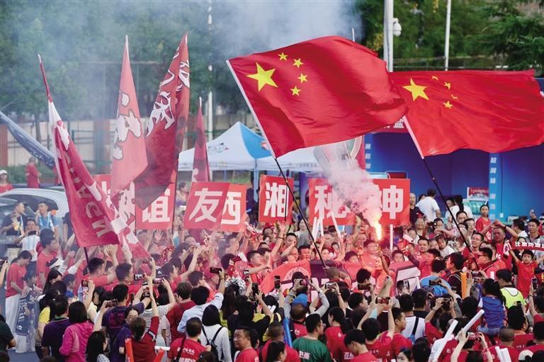 10月4日,開賽前,長沙球迷與湘西球迷在賽場外“拉歌”狂歡。 團結報全媒體記者 楊賢清 攝