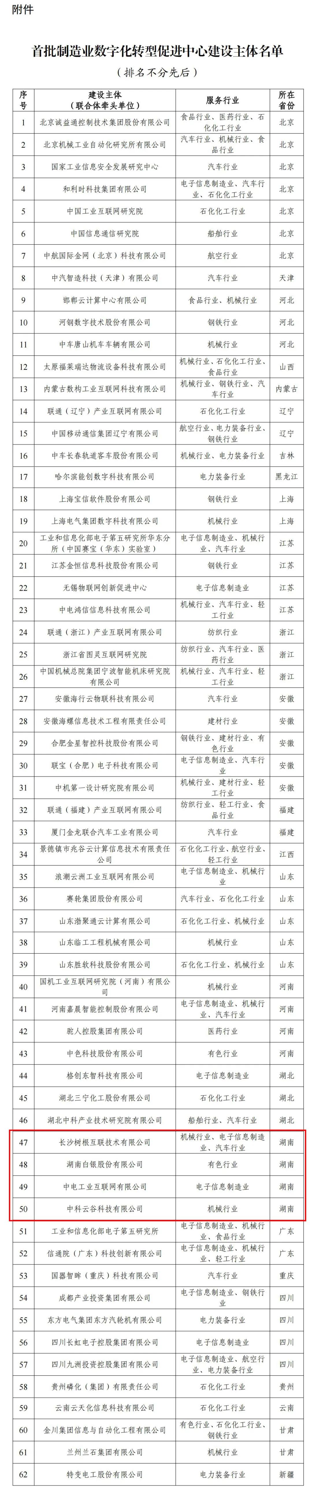 華聲在線10月13日訊(全媒體記者 謝卓芳)近日,工業和信息化部正式公布首批制造業數字化轉型促進中心建設主體名單。全國共有62家單位入選,其中湖南的長沙樹根互聯技術有限公司、湖南白銀股份有限公司、中電工業互聯網有限公司、中科云谷科技有限公司等4家單位成功躋身首批國家隊,數量位居全國前列。