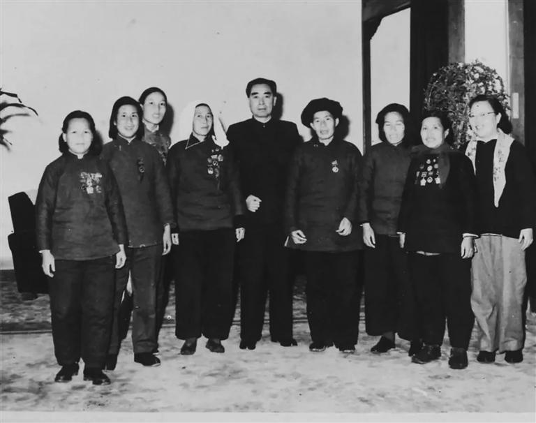 1958年12月楊玉翠(右四)參加全國(guó)婦女建設(shè)社會(huì)主義積極分子代表大會(huì)受到周總理接見的合影。