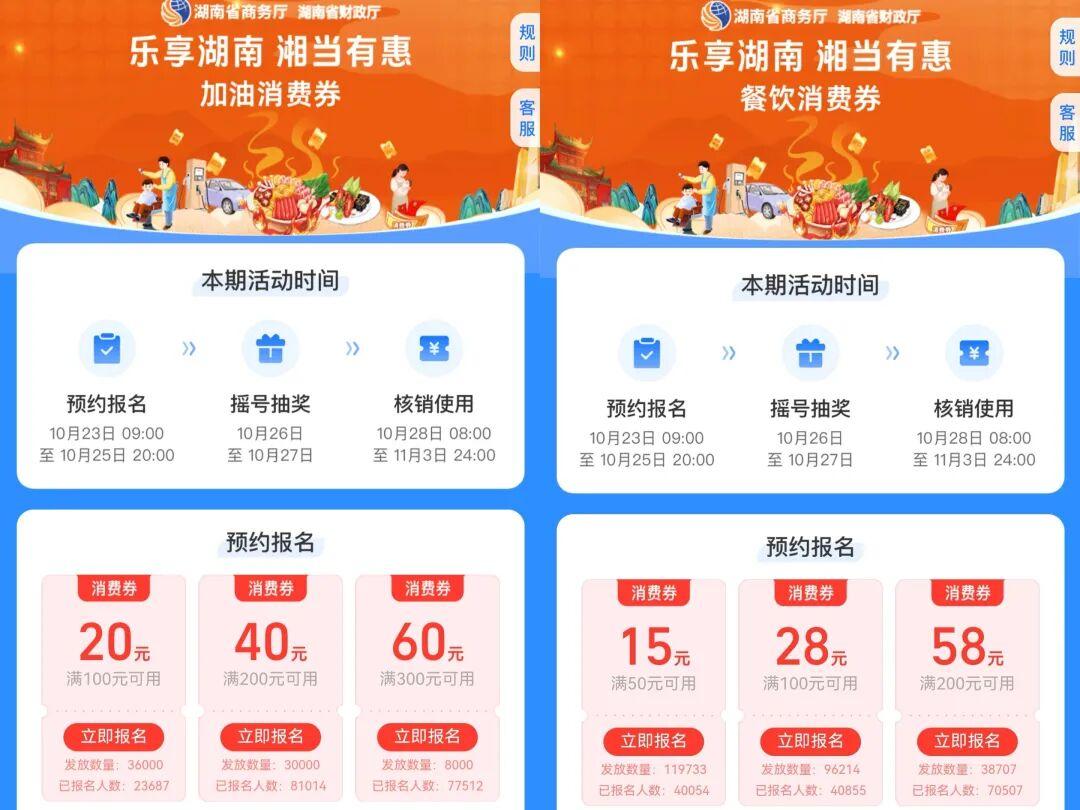 活動(dòng)期間(10月至12月),湖南在全省范圍內(nèi)發(fā)放總金額達(dá)1億元的消費(fèi)券,采用“報(bào)名搖號(hào)”機(jī)制,無(wú)需搶券,讓消費(fèi)者公平參與。10月23日至25日為消費(fèi)者報(bào)名期。