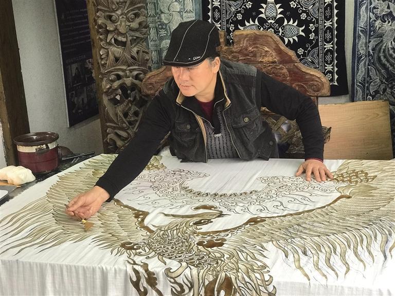 王曜正在進行蠟染創作。 鳳凰縣委宣傳部供圖
