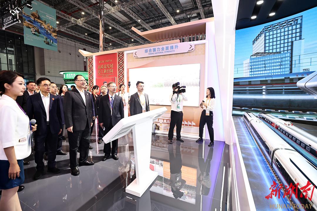 進博會湖南常設館聚焦“開放湖南, 湘遇世界”主題,以山水為幕、以人文為脈、以智造為橋,組織60余家湘企整裝亮相,布展面積較上一屆增加了一倍。毛偉明饒有興致地參觀展陳,勉勵大家精心打造“湖南城市會客廳”,更好發揮展洽聯動作用,全方位展示“湘”品形象、立體式講好湖南故事、精準化對接全球資源。