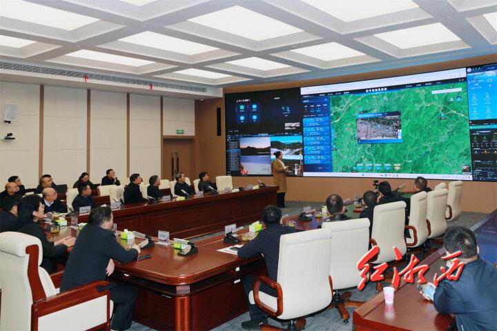陳華在數(shù)字保靖調(diào)度中心聽取數(shù)字保靖應(yīng)用場景建設(shè)情況匯報。周興云 攝
