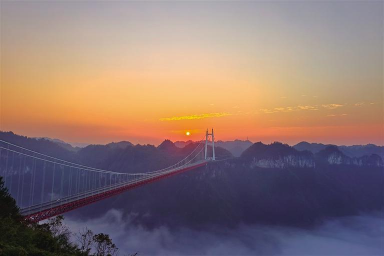 11月16日,在吉首市矮寨奇觀旅游區(qū),晨霧如浪濤翻涌,云海被染成橘粉與鎏金交織的幻境,矮寨大橋猶如一道橫跨天塹的長虹,與周邊的群峰剪影、遠(yuǎn)處日出東方的壯闊,共同構(gòu)成了此間獨有的山河盛景。 團(tuán)結(jié)報全媒體記者 張衡 攝