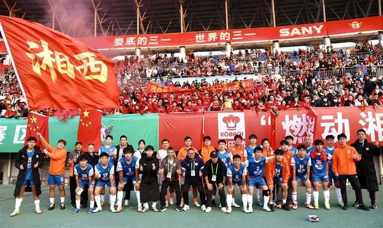 12月6日,湘超聯(lián)賽常規(guī)賽最后一輪,湘西隊客場不敵婁底隊,未進入淘汰賽而結(jié)束今年聯(lián)賽之旅。賽后,湘西隊球員與教練來到看臺前感謝湘西球迷并與球迷合影,球迷打出“湘西勇士,我們等你滿血歸來”的橫幅。 團結(jié)報全媒體記者 胡承鼎 攝
