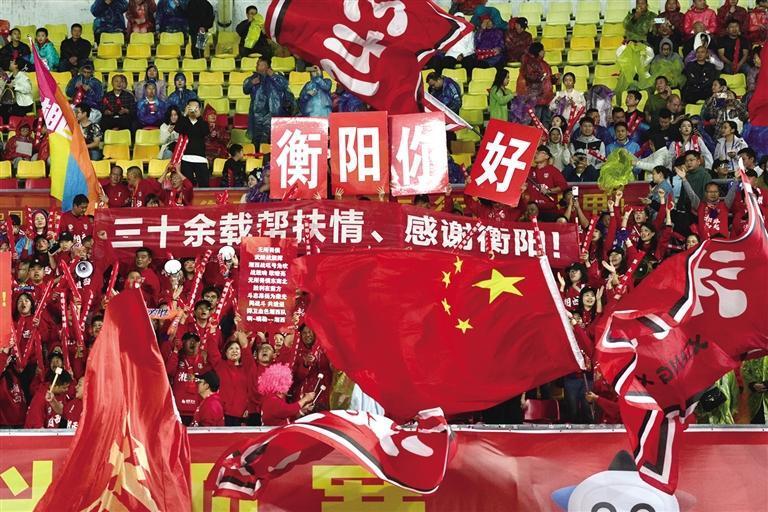 10月18日,“湘超”第六輪,湘西隊遠征“雁城”衡陽,湘西球迷在看臺打出“三十余載幫扶情、感謝衡陽”的橫幅。 團結報全媒體記者 楊賢清 攝