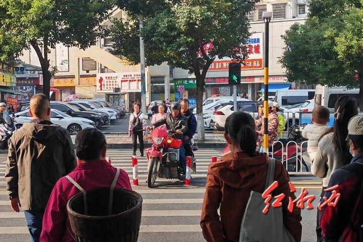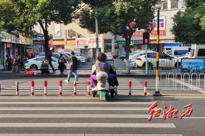 11月6日,記者在吉首市偉業廣場外的人行橫道處看到,之前相關部門修繕完整的隔離樁又缺失了一根。短短5分鐘內,就有10余名市民騎著電動車、摩托車等從人行道隔離樁缺口處穿行或轉彎掉頭。