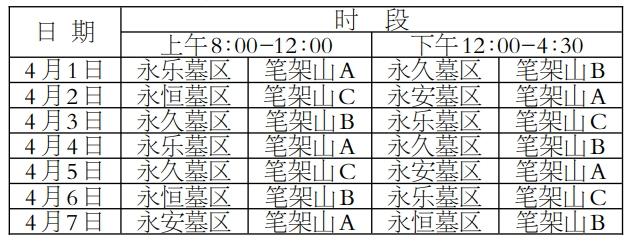 清明期間,為緩解安全壓力,興龍陵園采用分時段分墓區祭掃方式,每天開放兩個墓區,分兩批次祭掃,非指定墓區開放時間不開放祭掃。請市民根據墓區開放時段,合理安排祭祀時間,錯峰祭掃。具體墓區開放時段安排如下: