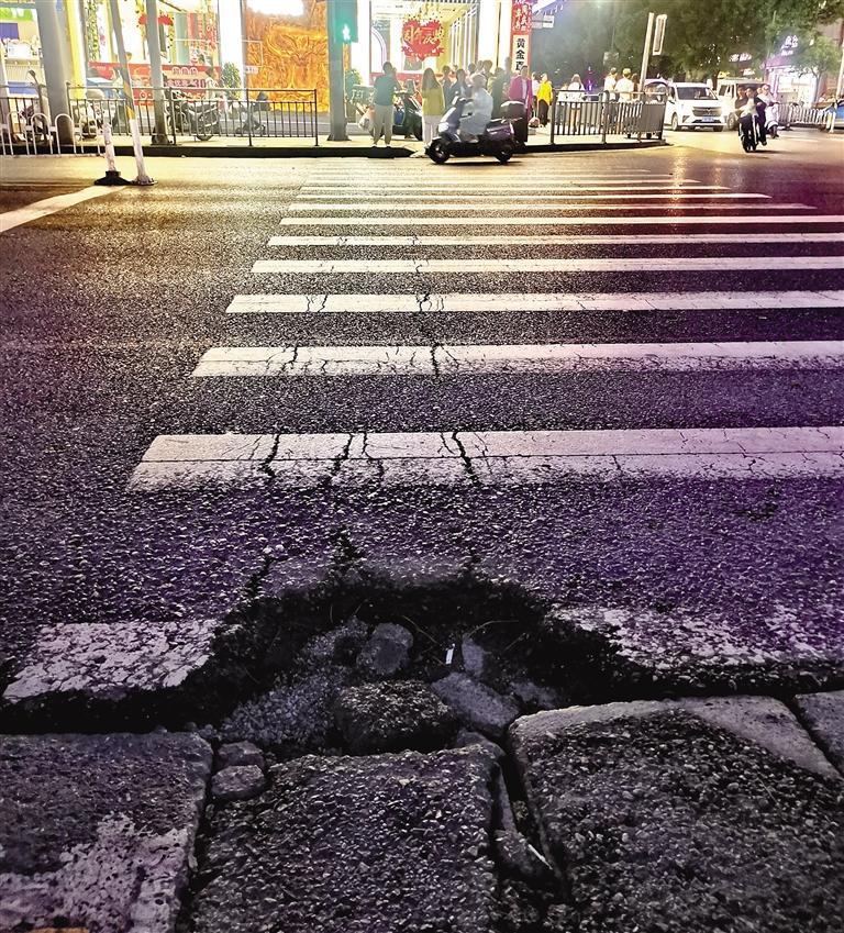 圖為花垣縣城建設中路與趕秋路交會的十字路口,人行道斑馬線路面出現一個大坑洞,行人經過時很容易被絆倒或崴腳。