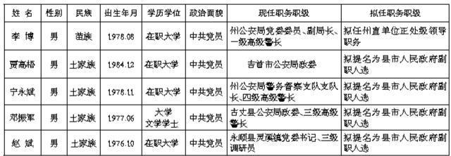 為加強對干部選拔任用工作的監督,提高識別和任用干部的準確度,現對州委常委會會議研究決定的下列5名擬任人選予以任前公示: